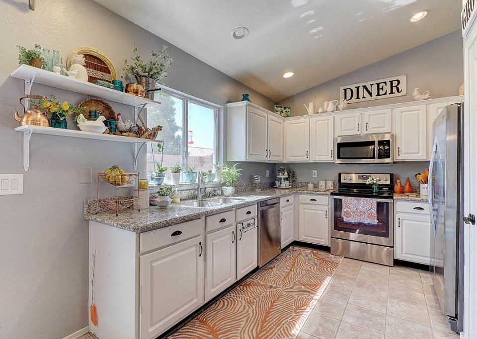 3342 N Saffron is an impeccably maintained single story home nestled in the highly sought after Red Mountain Community. This 3 bedroom 2 bathroom home is 1,317 sqft of impressive living space. Step inside and admire the soaring ceilings, neutral paint, and beautiful upgrades this home has to offer. Down the hall you will notice the main living space that leads into the perfectly sized dinning space and kitchen. The kitchen is equipped with amazing upgrades; stunning stainless steel appliances, ample cabinet space, a pantry, recessed lighting, and even granite counter tops. Each bedroom is perfectly sized with cozy carpet and one of the additional bedrooms even has an artfully crafted study space. The master suite boasts a large walk-in closet, vaulted ceilings and an abundance of natural light. The low maintenance backyard features a covered patio, gorgeous flagstone, and a massive tree that provides an abundance amount of shade. Come see this new home TODAY!