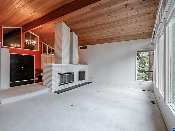 Discover a hidden mid-century modern home on a tranquil, tree-lined street. Walk into the inviting foyer, you'll be captivated by the living room's floor-to-ceiling windows and open beam vaulted ceiling. Adore serene, hilltop views of the surrounding forest that bathe the space in natural light. Home features a modern kitchen, two fireplaces, and a sunroom that seamlessly extends indoor living to the outdoors.Entertain guests on the back deck and enjoy the park-like backyard all year round.