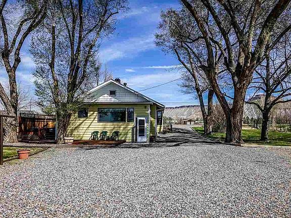 Charming farm house on 7.2 irrigated acres with amazing views, located just West of Palisade. There are 2 bedrooms on the main plus an office that can be used as 3rd bedroom. There is 1 full bath, and a 3/4 bath/laundry room including washer & dryer off the kitchen. Nice original wood floors, new carpeting, tile floors in bathrooms, 9 ft ceilings, large living room with lots of windows, updated kitchen/dining area with plenty of cabinetry and counter space & view window. All kitchen appliances included. Oversized 30x37 garage with RV storage, lots of outbuildings, mature landscaping & shade trees, some fruit trees (apple & apricot), large garden spot, grass pasture (currently leased through 2019), new roof, finished basement with tons of storage, new windows throughout home, redwood decks, new hot tub off the master, Breez Air cooler, & 7 shares of irrigated water. Room for horses & toys