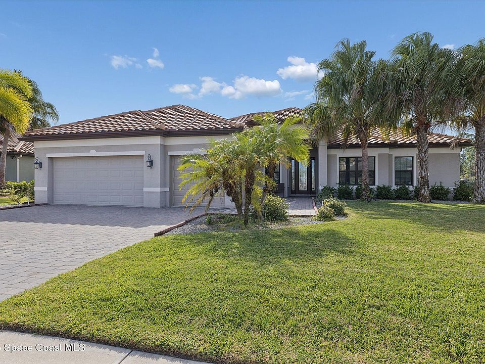 Welcome Home! This luxury design by D.R. Horton combines modern with classic. THE ESTATES at SAWGRASS LAKES Emerald model open floor plan provides large rooms, windows, granite counter tops and backsplash, stainless steel appliances with beautiful 42 inch cabinets, breakfast bar, dining. Stylish tile floor runs through the whole house. His and her walk in closet in primary bedroom, luxurious shower, relaxing soaker tub; granite countertops in all bathrooms. 240 VLT electric car charger installed in garage. Large, screened patio overlooking the splashing fountain in pond creating a serene atmosphere. Ideal living for the whole family. Resort style amenities with upscale clubhouse, gym, tennis and pickle ball court and more. The only private community pool in Brevard with a two story slide, a residence delight, nesting in lushes Florida greenery. Low association fee, onsite office, catering for your needs. Timeless tile roof, A/C, high grade appliances . 2018 built, like new. A must see