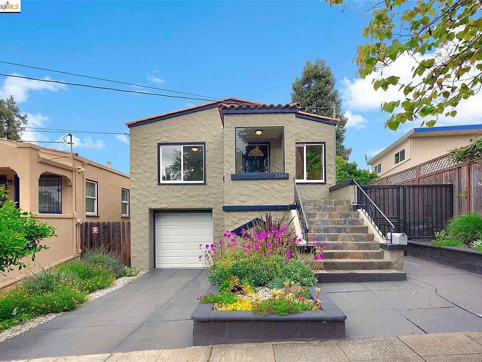 Move in ready Mediterranean! Inside, it's bright and airy. Wide room entries create an open feeling. Modern, artistic light fixtures add even more personality to this naturally charming home. The walls are freshly painted & contrast stylishly with hardwood floors. A light-filled front living room connects to the dining room. The open concept is ideal for lounging and entertaining. Form & function prevail in the kitchen--long granite counters, copious cabinetry, and sleek stainless-steel appliances & gas range equip the cook for serving up tasty cuisine while enjoying the views of the Oakland Hills. The bedrooms have generous closets & bookend the modern bath. The third bedroom, privately tucked in the back of the home, features broad windows on three walls, providing natural light & nature views. A large yard & patio beckons for outdoor dining & big time BBQs. A perimeter of lush, drought-tolerant landscaping & a soft green Japanese maple add to the color & tranquil atmosphere.