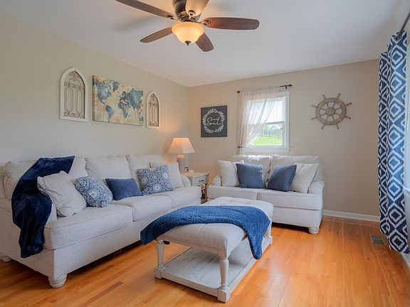 This quaint country home is perfect for a small family, nestled in rural Pulaski County on almost a full acre of beautifully maintained land. Enter into the cozy living room onto polished hard wood floors. Eat-in kitchen boasts a large pantry, lots of cabinets, newer appliances. Walk-out to a patio where you could certainly enjoy your morning coffee! Down the hall, find a completely renovated full bath with custom tiled tub and floors, back saver sink, and recessed lighting. So nice! Both bedrooms at the back of the house are bright with natural light from multiple windows, and the Master has a wall of closets. Around the back of the house, a landscaped walkway leads you to a 512 sq foot deck and a stone fire pit, perfect for entertaining! The full unfinished basement has lots of room for storage, laundry and walk out access, with plenty of room to store your lawn care materials. Insulated windows. This sweet home is bright, inviting, well cared-for, and ready for you to see today!!