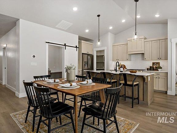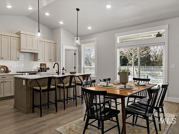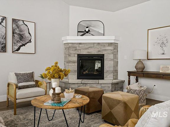 Practically new single-level home in Meridian near Bridgetower! This 1,757 sq. ft. gem features 3 beds, 2 baths, open floor plan w/vaulted ceilings, spacious great room w/Ceiling fan/& stone-faced gas fireplace, tech room behind barn door. The kitchen boasts a stainless steel farm sink, quartz countertops, and upgraded appliances & finishes. The master suite offers a split-bedroom layout, double sinks, a frameless glass shower, and new carpet. Enjoy a large covered patio, private front yard, and fully fenced backyard backing to open space. An oversized 3-car garage includes a deep utility sink + built in shelving & H2O Softner. Nestled in a quiet neighborhood near The Village, low HOA, and top restaurants, this home is super clean, beautifully landscaped, and move-in ready