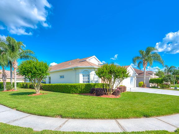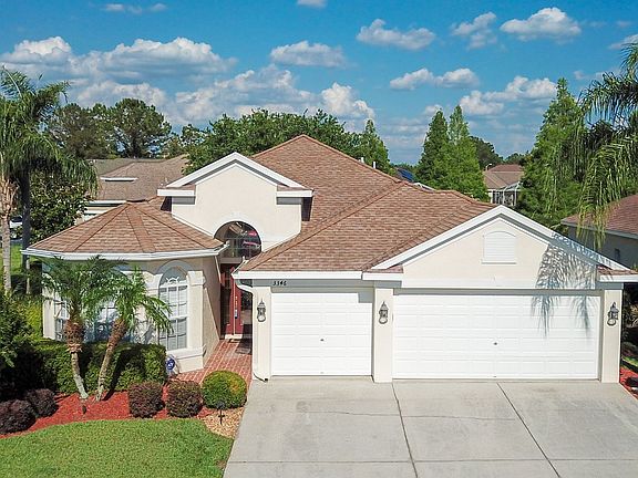 LIVE THE DREAM! ENJOY WIDE OPEN SPACE in this UPDATED, 1-story OPEN FLOOR PLAN with 2,042 sf, 3 Bedrooms, 2 full baths, DEN, HUGE screened & covered lanai situated on .22 acres & a 3-CAR GARAGE! Impressive curb appeal with a BRICK PAVER ENTRY, BEVELED GLASS front door & easy-care tropical landscaping with landscape lighting! UPDATED 20" TILE grace the main living areas with wide-plank HARDWOOD FLOORS in the bedrooms & den! The GREATROOM plan offers a DINING & FLEX SPACE--perfect for reading or music room! Tastefully UPDATED KITCHEN blends seamlessly with the spacious family room & offers NEWER 42" WOOD CABINETS w/CROWN, GRANITE Counters, TRAVERTINE BACKSPLASH, breakfast nook & newer GE STAINLESS APPLIANCES incl a French-Style Refrigerator! The spacious master bedroom boasts hardwood floors & a large walk-in closet. The adjoining master bath includes dual sinks, linen closet, a garden tub & walk-in shower! Bedrooms 2 & 3 share a spotless guest bath with tub/shower combo! The Den can become Bedroom 4 & makes the perfect home office or craft space! Resort-style living 365 days of the year in the screened LANAI with brick paver accents. Extras include neutral interior paint, some PLANTATION SHUTTERS, gutters & downspouts & views from the lanai of #10 fairway! Community amenities include a gated entry, 18 holes of golf, Mulligan's full-service restaurant with nightly specials, miniature golf & lighted driving range! Minutes to Publix, Land O Lakes Sports Complex, schools, Costco & the Tampa Prime Outlet Mall!!