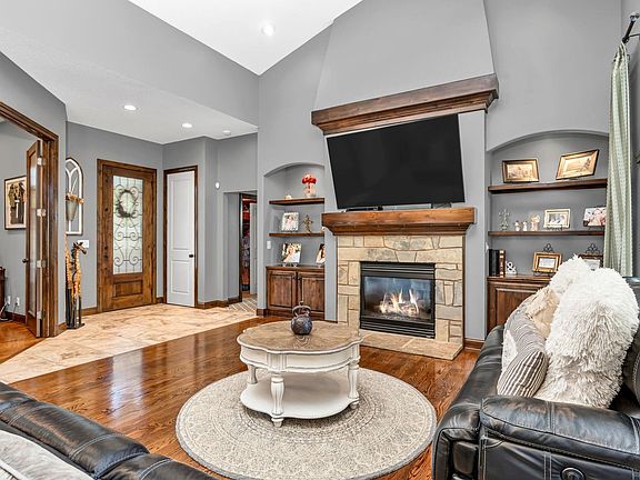 Stunning home in the sought after Fox Ridge neighborhood! Curb appeal, gorgeous woodwork and upgraded finishes welcome you. This 5 bedroom, 3 full bathroom home features vaulted ceilings, hardwood flooring, main floor office, drop zone and a walk out basement. Spacious rooms, transom windows, built in cabinets, a gas fireplace and the open floor plan accentuate the main floor. The kitchen includes stainless steel appliances, under cabinet lighting, walk in pantry and a large island with seating for four. The primary bedroom offers plantation shutters, walk in closet, two vanities, large bath tub, walk in tiled shower and a water closet for privacy. There are two additional main floor bedrooms near the hall bathroom. Downstairs the walk out basement features two bedrooms, a full bathroom, game area, family room with a gas fireplace and a dry bar with roughed in plumbing. Your private oasis awaits in the fenced back yard with mature trees, a patio area and covered deck with sunshades. Walking paths to the Maize South School campus, two pools, playground and sidewalks throughout are amenities in this picturesque neighborhood. Welcome home!