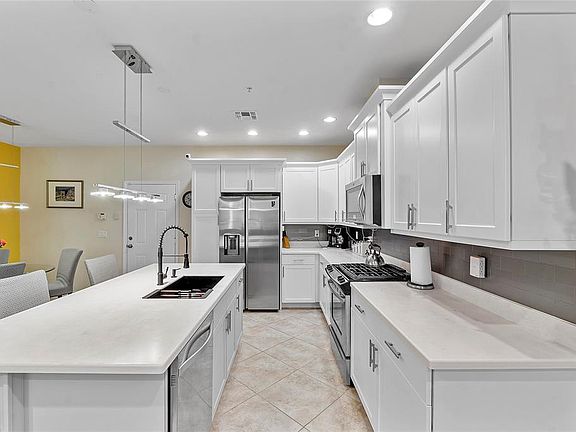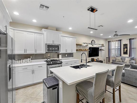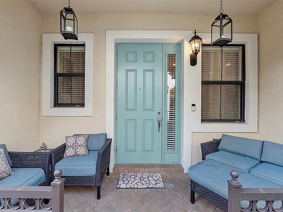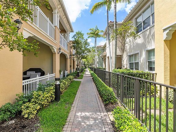 Artesia is an exclusive guard gated community with many luxury ammenities. This two story Mediterranean style townhome has 3 bedrooms, 2.5 bathrooms and a two car garage. The front porch entrance leads to an open concept living area with an updated kitchen with white cabinetry, white quartz countertops and SS appliances. Large island with seating along with a dining area. Neutral tile flooring downstairs and wood laminate on stairs and second floor. All 3 bedrooms are upstairs. Primary suite has private balcony. Primary bath has dual sinks, large shower & large walk-in closet. Additional 2 bedrooms and 1 bath and laundry room all upstairs. Impact windows thoughout. Custom Gladiator garage system with cabinets, slat walls and flooring. Water filtration system for entire home.