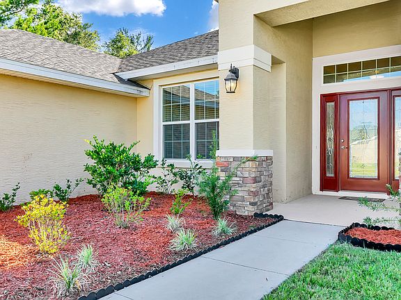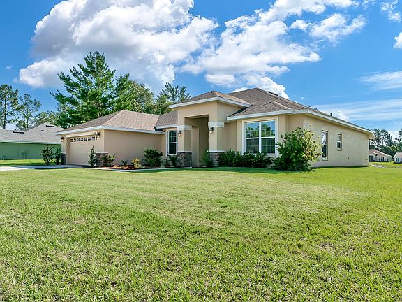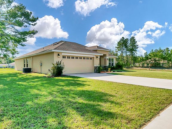 Welcome home to this almost NEW 2017 Adams built home located in the new community of Plantation Palms! This 4/2 with a bonus room is move in ready and perfect for a family. Master bedroom with trey ceiling and walk in leads to en suite with dual vanities, shower and soaking tub. Kitchen boasts wooden cabinets, pantry, eat in area and stainless appliances. Additional bedrooms are all 11x11 and share a bathroom with dual sinks, tub and shower. Large open floor plan perfect for entertaining. Covered porch lends even more space and over looks the large back yard. Home is situated on 0.5 acres with No Build behind and to the right of the home. Call today for your appointment to view!