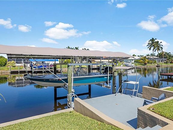 Quick Gulf Access on the Rubicon Canal! Boater's dream on a wide canal (120') with only 1 quick bridge ( 11.5 high) to the Caloosahatchee River and Gulf of Mexico. Established neighborhood with mature landscaping and move in condition. Recently renovated with 20x20 porcelain tile on the diagonal, stainless steel appliances in spacious kitchen with island, inside laundry, and 2 sets of French doors overlooking boat lift with canopy. City water and sewer in and all assessments paid! Plenty of room to add a pool. Easy to show, but occupied. Don't miss this immaculate home! Call today!