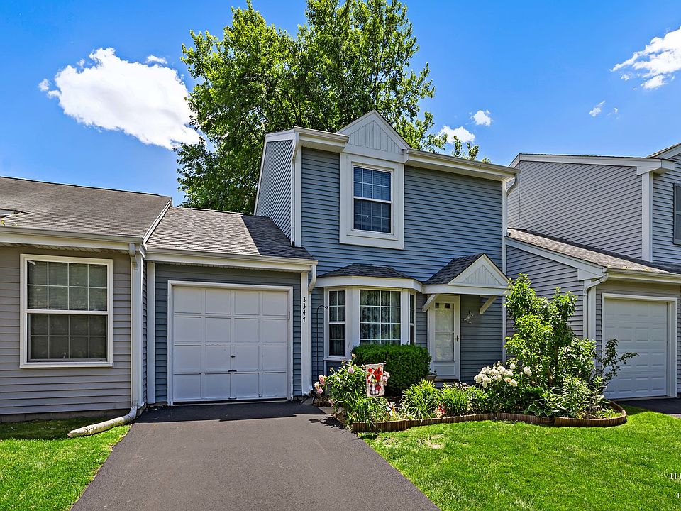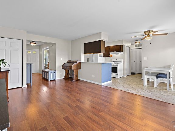 Move-in ready 3 bedroom 1.5 bath townhome with attached garage and tons of updates in peaceful Southport Village community. Newer wood laminate flooring in Living room & Dining rooms and newer carpet upstairs. All bedrooms have wood slat blinds. Both bathrooms have been updated. Newer driveway, windows, siding, and hot water heater. Kitchen offers a breakfast bar and dining room is highlighted by a bay window. Washer/dryer in-unit. Attached garage and great guest parking across the street. Private patio features lovely backyard views and shade tree. Easy maintenance with townhouse living. Great Island Lake location so close to the lake and Fox River for fun in the sun this summer!