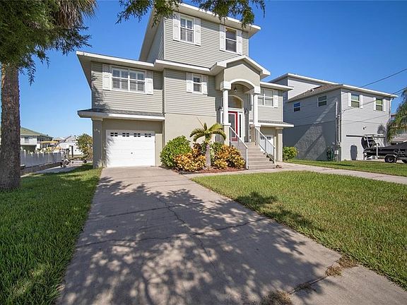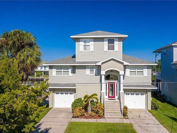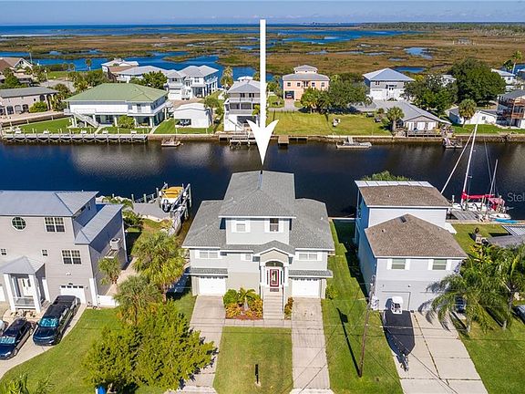 Your dream house on the water awaits. This beautiful and well built home not only has the looks but the structure you would want. Builder put in 20 piers, twice the amount required by code and high impact windows as well. Entrance to the garage gives you access to the elevator which takes you to the main or second level and opens to the spacious living room and kitchen and 2 nice size bedrooms. Balcony off the living room and one of the bedrooms offers breathtaking views to the open waters of the Gulf. The second level space is completed with a full bath, dining area, large walk in pantry in the kitchen and laundry room. One more level up to the master suite with it's own 10x19 balcony offering privacy and more of the exceptional gulf views. This space is truly one you will cherish. Ground level access from garage via sliders to large backyard with 150 foot concrete seawall and floating dock. Easy access to the gulf and the views from the multiple balconies are everything you are looking for in your new home on the water Seawall was rebuilt in 2008 and home has been freshly painted.
