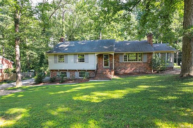 Wonderful Stratford Hills brick rancher with finished walkout basement. Home features 2400sqft, 4BR, 2.5 Baths, and loaded with updates. Renovated kitchen with tiled floors, custom cabinetry, stainless appliances, corian coutertops, breakfast nook, and pendant lighting. Dining room is open to kitchen that overlooks rear yard, has tiled floors, chandelier, and also access to wonderful 15x12 side screened porch. Large formal family room w gleaming hardwoods, wood burning brick fireplace w detailed moldings, and crown molding. Master suite with hardwood floors, walk in closet, and private bath w tiled floors, stand up shower, and newer vanity & fixtures. Two other spacious secondary bedrooms, one with beautiful builts ins, both with hardwood floors and single door closets. Finished walkout basement including a large family room w 2nd fireplace, 4th bedroom (no closet) or office space, large utility room, 1/2 bath, huge unfinished storage area, and an oversized 1 car garage. This home is nestled on a private .5 acre lot and centrally located to it all. Just minutes to shopping, restaurants, schools, all major highways, and right next to the James River. Come see today!!