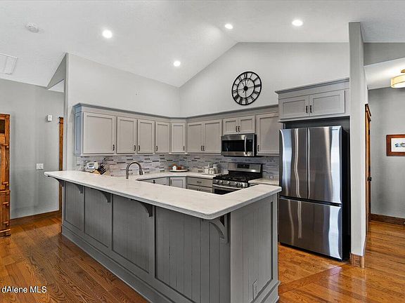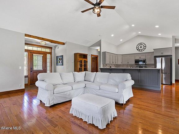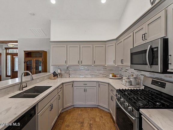 Immaculate, updated home on an oversized lot in the highly desirable Coeur d'Alene neighborhood of The Landings! This 3 bed, 2 bath home has been completely updated including a remodeled kitchen with Huntwood cabinets, stainless appliances, granite sink, and much more. Vaulted ceilings in the kitchen and living area combined with 9' ceilings throughout the rest of the home provide a spacious and open feel. The master suite has double closets, a spacious shower, and a luxurious soaking tub. Countless upgrades throughout the home, including hardwood flooring, custom trim, gas fireplace, new cordless blinds, and custom woodwork give this home a high-end luxury feel. The house and 3 car garage sit on a large and beautifully landscaped .29 acre lot. Front and back yards are equipped with automatic sprinkler systems. The large, completely fenced, back yard has a covered patio and is filled with beautiful perennials, as well as boasting a completely organic garden area with strawberries, raspberries, blackberries, and an assortment of vegetables all on its own automatic watering system. This home is just 3 blocks away from Landings Park, an 11 acre neighborhood park with playgrounds, splash pad, basketball, volleyball, tennis courts, horseshoe pits, as well as paved bicycle trails, restrooms, and picnic shelters that can be reserved for group gatherings. If you are looking for one of the nicest homes in one of the nicest neighborhoods in Coeur d'Alene then this is the home for you!