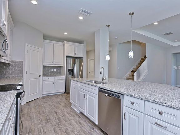 This stunning sought after two story five bedroom, 3.1 bath, 3 car garage with a huge 15X22 game room/bonus room in the gated village of Cypress Bend in Watergrass is model perfect and move in ready! The master retreat downstairs on the first floor is private with lots of light and has a huge walk in closet, his and her sinks in this truly upgraded home with all the bells and whistles. There are 4 bedrooms upstairs with a spacious game room for movies, entertaining, big enough for a pool table and anything else you want for fun and entertainment. The open floor plan is fantastic for your family and friends to enjoy each others company in the huge great room. The gourmet kitchen is breath taking with it's enormous granite counter island, tons of 42 inch cabinets with crown molding, stainless steel appliances, and natural light coming in the windows to enjoy from your private partially fenced yard and huge extended screened in lanai. The main living areas have upgraded 7x22 Ventura Plank tile flooring, and all bedrooms have carpet. This home is centrally located near the Groves Shopping Center, Florida Hospital, Wiregrass Mall, Tampa Premier Outlet Mall, ICE Complex, Colleges and has it's own Clubhouse, pool, park, antique lamps, fitness center with HD TV's, playrooms and more. Don't miss this one!!! Please follow COVID-19 guidelines.