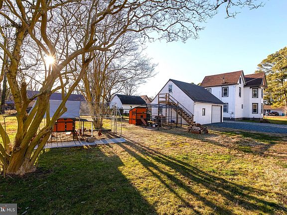 3BR 2BA (or 2.5 BA) Modern Farmhouse, situated near the historic town of Crisfield, with wrap-around porch, detached garage, and 2 pet chicken/hen enclosures. This 1540 sq foot stylish and clean home features all new windows, new stainless appliances, and is beautifully updated and shows pride of ownership. First floor features new LVP flooring, a very spacious eat-in kitchen with gas stove, microwave and refrigerator, matching cabinets and fully restored original hutch w/added lighting. A rear staircase leads from the kitchen to the rear 2nd floor area . Previous 1/2 bath off of kitchen has been converted to a pantry/storage area but could be switched back to a half-bath. Gorgeous oversized dining room with lots of windows, original solid wood door with etched glass, and access to the wrap around porch. Cozy family room boasts a toasty propane fireplace & easily heats up the whole area in no time! Original masonry chimney exists so converting back to wood or pellet stove is also possible. Generous sized laundry room with full bathroom sits right off of the kitchen on the first floor. Glowing natural light fills this home and the perfect blend of modern and classic elements create a true sense of home. The traditional wood stairs feature handsome newel posts and solid construction you don't see in today's homes. Upstairs, spacious and bright, Bedroom 1 features LVP floors, 2 closets, lots of windows, and old fireplace mantle. Bedroom 2 has carpet, closet and nice windows. Rear hallway leads to the smaller 3rd Bedroom, also carpeted w/closet, and the hall bath which has been fully remodeled and features an attractive tile tub/shower combo. Detached garage has electric, a manual rollup door (outlet is in ceiling for a lift) makes a great workshop or hobby room, has newer salt treated steps to second floor additional storage area. Oil boiler for hot water baseboards is housed in the garage and is one of several heat sources. Above ground oil tank has been replaced within the last year. A mini-split was added within the last year to the first floor family/living room for additional heating and central cooling. There is a gas(propane) ventless fireplace in the living room as well. Storage room on 2nd floor has permanent ladder to 3rd floor attic space, and room to build permanent steps. Large attic is great for storage, but could be a fun finished living space! Huge back yard with beautiful crepe myrtle trees & grape vines for growing your own grapes. The furnace has been recently rebuilt! A fresh load of gravel provides a large parking area between house and detached garage, and additional parking is located behind chicken coop. Chickens and Coop are negotiable with an offer. No city taxes. Current owner carries flood insurance for $600-700 per year.
