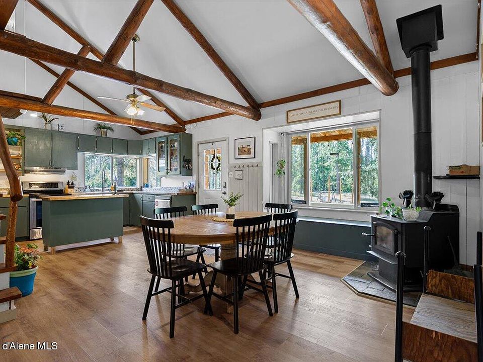 Seller is willing to pay 2% seller credit! Welcome to your serene countryside retreat—a rustic-chic haven nestled on a spacious, tree-lined property with a huge 30'X60' shop! This gorgeous home blends mountain-cabin charm with modern comforts: vaulted ceilings and warm wood-tone flooring set a welcoming tone. The open floor plan centers around a cozy wood stove and leads to a bright kitchen with beautiful cabinetry, spacious counters, stainless appliances, and a central island perfect for gathering. Luxurious primary suite offers generous closet space, plus a flexible loft area that could serve as guest quarters, office, or studio. Upstairs, sloped ceilings and sturdy beams frame a spacious bedroom offering peaceful privacy. Step outside to enjoy covered front porch seating or retreat to the backyard's firepit area—a perfect spot for twilight conversations or marshmallow-roasting evenings under the pines. Children's swings and ample grassy area complete the outdoor experience!