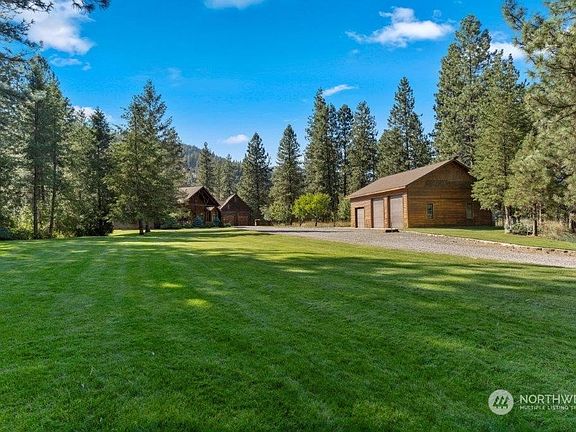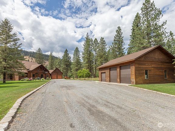 Find your retreat! 4Bdr, 4Bth lodge home, where luxury meets rustic charm. Nestled on 10 acres on the Kettle River, the home is surrounded by natural beauty. Inside, you'll be greeted by a grand, open floor plan, the focal point of the great room is a magnificent two story fireplace. Three en-suite bedrooms add comfort and privacy. The expansive gourmet kitchen is a chef's dream, with commercial-grade appliances and ample counter space. Custom hardwood floors lend an air of elegance and warmth. Property Includes an oversized 2-car attached garage, and 4-car detached garage/shop. Outside, find a mix of manicured lawn, and trees. Enjoy mature fruit trees/garden, fishing and swimming right out your door. Owner Financing 600,000 down, 5%, 15yrs