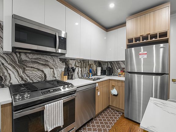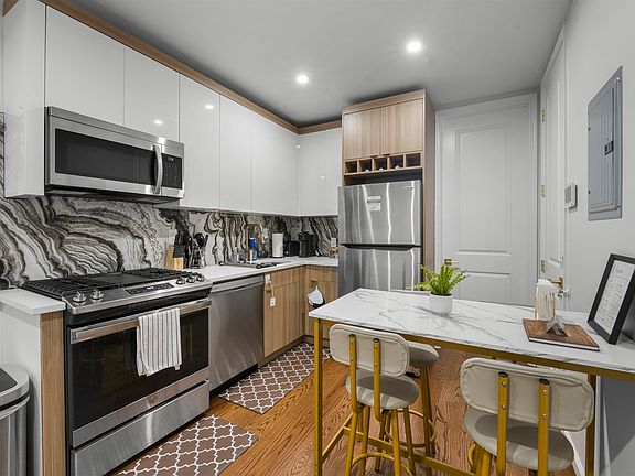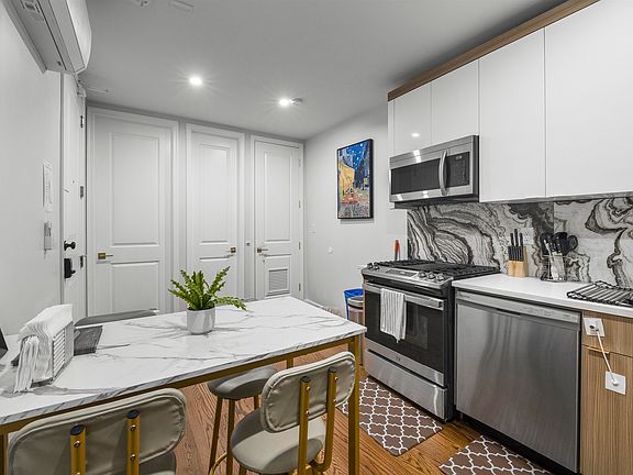Every unit offers something unique: Unit 1 includes a full-size storage basement, Unit 2 will be delivered vacant and features a private patio, and Unit 3 boasts a private rooftop deck with sweeping city views. All kitchens impress with white quartz waterfall counters, dark marbled quartz backsplashes, custom cabinetry, gold fixtures, and stainless-steel appliances. Bathrooms are equally striking with dramatic accent walls, smart lighted mirrors, double vanities, glass showers, and oversized soaking tubs. Bedrooms feature custom walk-in closets, while in-unit washer/dryers add convenience.