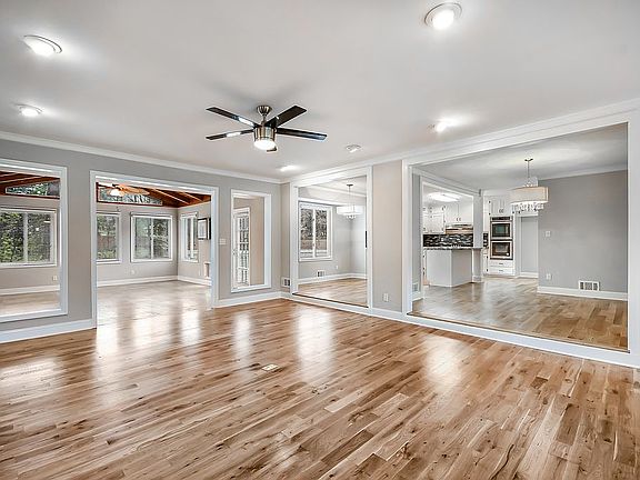 Stunning, open concept on a Fully Finished Basement with exceptional natural light and gleaming hardwood floors throughout main level. Chef's kitchen with SS appliances, granite counters and a large island overlooks a spacious living room, separate dining and breakfast rooms, an amazing sunroom with vaulted ceilings and walls of windows, and a 400 sqft deck. Spacious and sunny master suite with oversized, private deck. Renovated master bath with gorgeous fixtures, oversized jetted tub and giant shower with 4 separate shower heads, and walk-in master closet with custom built shelving and built-in island! Terrace level provides a guest suite with full bath, kitchenette and living room/play room, a man cave, a finished 3rd car garage transformed into a large bonus room and a 400 sqft storage room with builtin shelving and a large island. Massive front and back yards with spacious, level ground. Backyard is enclosed by privacy fence all around with a serene treeline, thick, comfortable grass, a custom firepit enclave and an oversized woodworking shed with classic, red, double-door barn design.