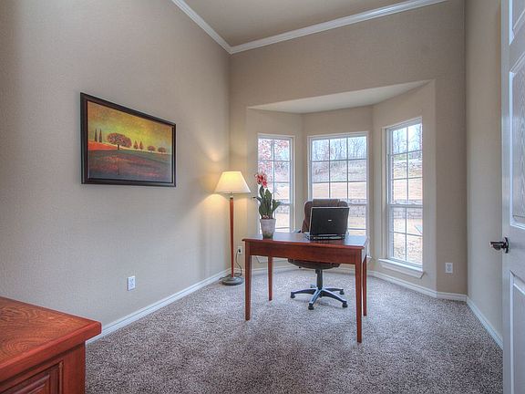 Stunning property less than 10 minutes from DT Tulsa w/a secluded feel. Enjoy .73 acres w/over 1 acre of groomed open space behind it, owned by the HOA, perfect for entertaining. This 3404 SQFT home feat. 4 beds each w/private full bath & lg walk-in closets. Additional 1/2 bath off the kitch. Master suite w/lg bath w/a jetted tub & shower. Above ground tornado shelter in the laundry rm, office w/bay windows, granite counters, French Doors, oversized 3 car garage, 3 zone heating & A/C and so much more!!