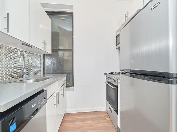 This apartment features a renovated kitchen with stainless steel appliances, including a dishwasher, as well as ample cabinet and counter space, a spacious living room with two large windows allowing for endless natural light, a full/queen-sized bedroom that can also accommodate a desk and dresser, as well as closets within, and a fully tiled bathroom with a tub.