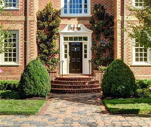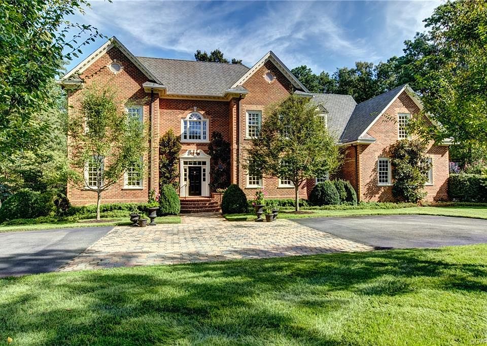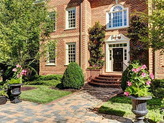 This handsome two-story brick home offers exceptionally inviting views and mature front yard with magnolia plantings and expansive terraces overlooking the lovely and private backyard. Backing to a substantial wooded area on the fifth hole of the Sabot Course at Hermitage Country Club, it has a private golf cart lane leading directly to the golf course. Inside the home, quality craftsmanship and open living spaces set the tone for an easy-living home with gracious details, including 10' ceilings on the first floor and true-divided light windows with Plantation Shutters across the front. Features include formal rooms, a large open chef's kitchen with informal dining all open to the large family room, a large private first-floor master suite, four more bedrooms and 3 more baths upstairs, and a large recreation room/bonus room. The walk-up attic (42' x 15') offers an expandable space and is fully floored. There is a loft area overlooking the foyer and living room, and another open balcony overlooking the family room/kitchen areas. Exceptional natural light pours in through the many windows, especially in the vaulted ceiling areas. A true gem!