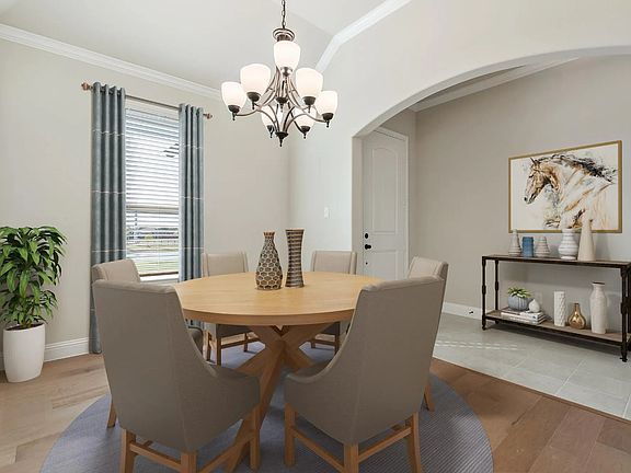 Warm and welcoming over a single sweeping level, this open-concept 4 bedroom, 2 bathroom floor plan offers bright and airy spaces suited for everyday living. Step inside from the covered porch and into the vast foyer with boxed ceilings. Wood floors flow from the entry through the kitchen, nook, and family room. The foyer opens to the formal dining room, the ideal space for hosting dinner parties or enjoying quality family mealtime.Set at the heart of the home is the open-concept kitchen, making it easy for everyone to stay connected. The spacious kitchen is complete with ample counter and storage space, a large central island, stainless steel appliances, granite countertops, gorgeous cabinets, and a corner walk-in pantry. The kitchen opens to a breakfast nook with a built-in window seat, providing a sunny space to enjoy early morning coffee or for additional seating.The family room of this home is a great place to get together, able to fit the whole family and their friends comfortably. The natural light that it enjoys is inviting and brightens up the room. It even leads straight out to the back-covered patio so that one can easily transition between inside and outside activities. The master suite is the ultimate place to enjoy privacy, relaxation, and comfort within one's own home. With a large bedroom, dual vanities, garden tub, and separate walk-in shower all at your disposal, you can indulge in the luxury of peacefulness without leaving your house. If a quick ventur