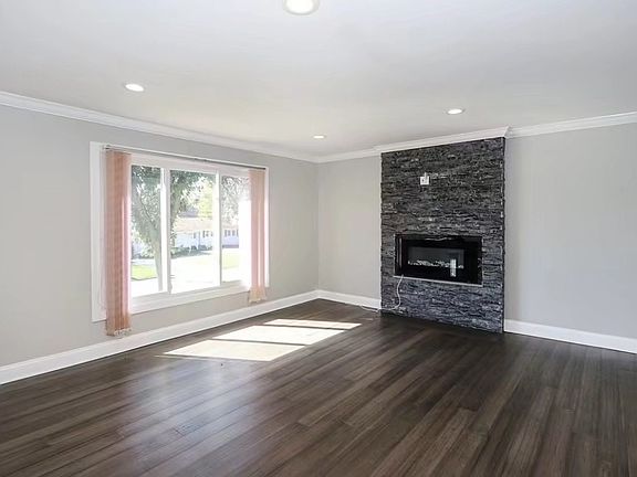 This bright and modern home features an open floor plan with a spacious living room highlighted by a stunning floor-to-ceiling stone fireplace, a chef's kitchen with stainless steel appliances, white shaker cabinets, and an eat-in dining area perfect for gatherings. Both bedrooms offer closets and hardwood floors throughout, with two full bathrooms providing convenience and comfort.