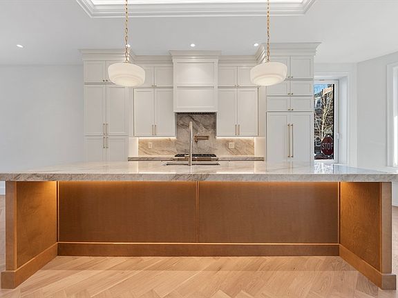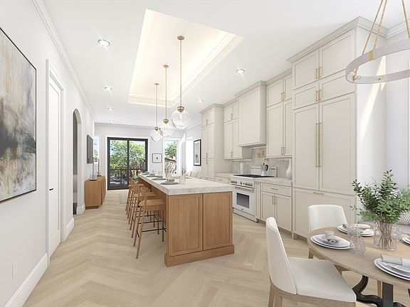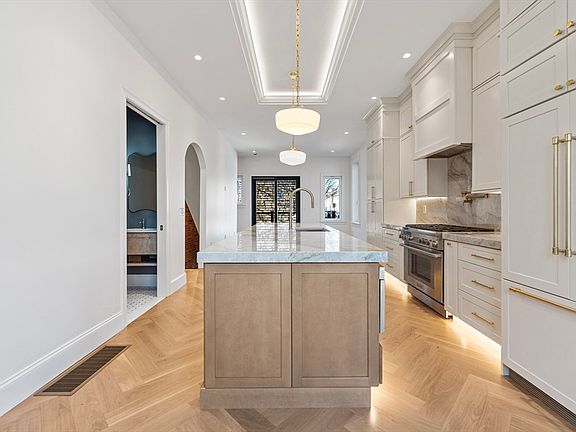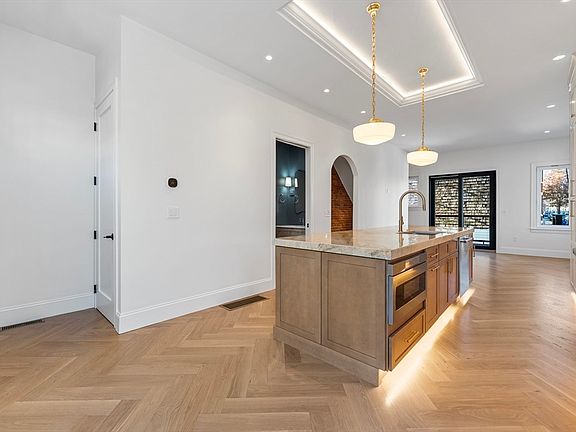 This corner lot single-family home is being crafted to the highest standards. Spanning 2,762 SF, it includes 2 parking spots, 4 beds, 3.5 baths, 2 kitchens, and a two-tiered private backyard. The main kitchen includes a built-in breakfast banquette, floor-to-ceiling cabinetry, and Thermador appliances. Off the kitchen, is the main living room which opens to a walkout deck, patio, and turf area. The second floor has 2 spacious bedrooms, a full bath, and a laundry room with built-in cabinetry. The top floor is dedicated to the primary suite, featuring a walk-in closet, wet bar, heated floors, rain shower, double vanity, makeup station, and separate toilet room. The lower level provides extra living space, a second kitchen, family room, bedroom, and full bath—perfect for an in-law suite. Custom details include restored brick walls, high ceilings, 8 ft interior doors and white oak herringbone floors. Private showings only after open house.
