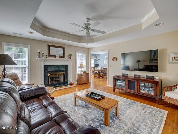Inside, a welcoming foyer with beautiful hardwood floors leads to a spacious living area with a gas log fireplace, tray ceiling, and ceiling fan. The modern kitchen is equipped with granite countertops, stainless steel appliances, a smooth-top range, built-in microwave, and elegant backsplash. A large breakfast nook or gathering room with wainscoting and hardwood floors adds to the home's charm. The formal dining room boasts a vaulted ceiling and wood floors, perfect for entertaining. Off the garage, a convenient mudroom includes a full laundry room with a washer, dryer, and cabinetry for storage.