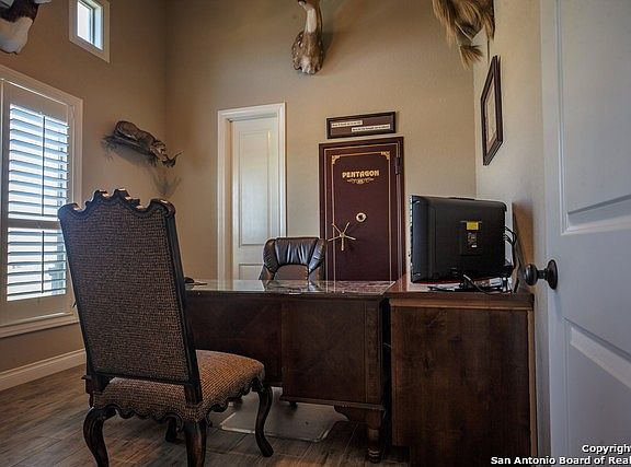Beautiful custom home builder model. Gated, guarded community. This home sits on a 1 acre quiet street. Nice view of the TX hill country, sunset off the front, in the back you will enjoy amazing oak trees, and the evening shade! 4 bed, 3.5 bath, 3 car garage home features; High ceilings, custom cabinets, hard wood floors, 2 Rena ii tank-less water heaters, Foam insulation, built is safe that can also be a panic room, 4 thermostats, media room,storage shed, stained concrete back patio & drive.