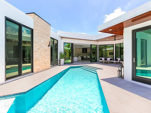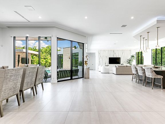 Welcome to an extraordinary single-story residence nestled on a sprawling oversized lot of 13,582 square feet in the coveted Golden Triangle of East Boca Raton. This exceptional home, crafted by NuVision Developments in 2021, features 5 bedrooms, 5 ensuite bathrooms, and two half baths, highlighted by a primary wing that overlooks the saltwater pool and summer kitchen.The interior showcases a beautifully designed open concept layout with high ceilings and 30'' x 60'' matte Italian porcelain tile flooring. Flooded with natural light, the sun-drenched great room, kitchen, and dining area boast expansive glass sliders that seamlessly blend indoor and outdoor living, offering panoramic views of the resort-style pool, patio, summer kitchen, and cabana bath. The outdoor space is a tropical oasis, enhanced by an expansive yard including a putting green.