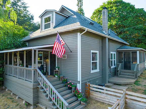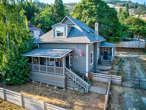 A must see 1902 Victorian/Craftsman home with beautiful farmhouse features overlooking the city. Enjoy your mornings relaxing under one of your two covered porches. Main level primary suite with a luxury tiled walk in shower, dual sinks, and a soaking tub. Vinyl windows, Ductless AC, stainless steel appliances, granite countertops, and vinyl flooring with carpet upstairs. A detached garage with workshop space. Close proximity to I5, You don't want to miss your chance on this beauty!