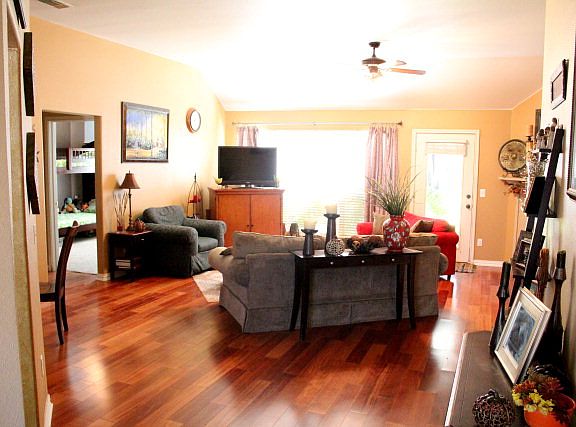 BEAUTIFUL HOME, LOVINGLY CARED FOR, & WAITING FOR ITS NEW FAMILY! Elegant Wood Floors greet you as you enter the home & stretch throughout the living area. There is a Fireplace in the corner and nice views out to the manicured back yard. Speaking of the back yard - it is INCREDIBLE! Fire Pit, Covered Patio, level area for playing, & lots of room to run. The kitchen features quartz counter tops, tile floors, built in microwave, under mount stainless steel sink, & a view into the living rm. The Master BR is spacious and the Master Bath is nice w/ dual vanities & a separate tub & shower!