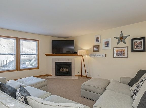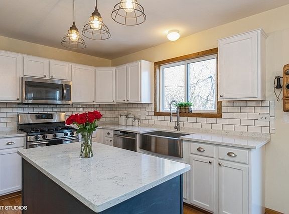 This 5 bedroom Algonquin home provides plenty of space to spread out and even a possible in-law arrangement. On the main level you'll find a spacious updated kitchen with the functionality of an island and eating area, as well as the beauty of white cabinets, quartz countertops and stainless steel appliances. It flows seamlessly into the cozy family room with gas fireplace. The open wall to the living room gives separation but an open feel. More formal meals can be hosted in the dining room off the kitchen. The large laundry room doubles as a mudroom with access from the garage. Upstairs, everyone has their space with four bedrooms including the huge master suite complete with a large double walk- in closet, dual sinks, separate shower and jacuzzi tub. There is also the added space of a loft which is perfect for a playroom, home office, or simply more living space. In the finished basement there is the convenience of a second kitchen, full bath and fifth bedroom with living space--making a great possible in-law arrangement. Outside, there is plenty of room to run with a large fenced backyard, large patio for entertaining and a shed for additional storage. Solar panels on back roof make for an efficient home. Near to shopping and dining and in close proximity to I-90.