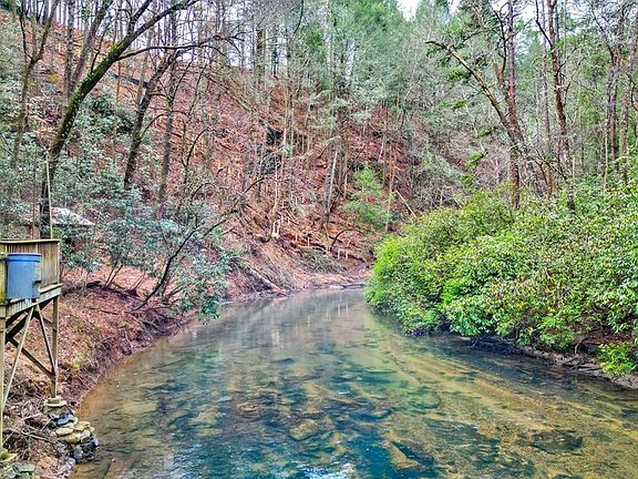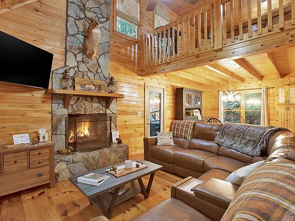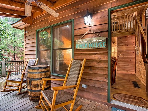 Nature abounds at this furnished cabin nestled on the banks of the Ellijay River conveniently located between Ellijay and Blue Ridge. End of the road privacy in this gated community will have you enjoying the sounds of the river from your hot tub perched at the rivers edge. This home features an oversized loft with a bedroom and updated full bathroom with double vanity on each level. Open concept living with floor-to-ceiling stone fireplace; well equipped kitchen with brand new quartz counters & ample size dining area. Enjoy the outdoors from the covered porch overlooking the river from the house or off the fishing deck at the water's edge. New steps down to the river have recently been added to improve river access. Additionally, you have a small fenced area at the rear of the home and a whole house generator. NO HOA fees, Short Term Rentals Allowed, close proximity to golf course and vineyard. Permitted for 2BR septic.