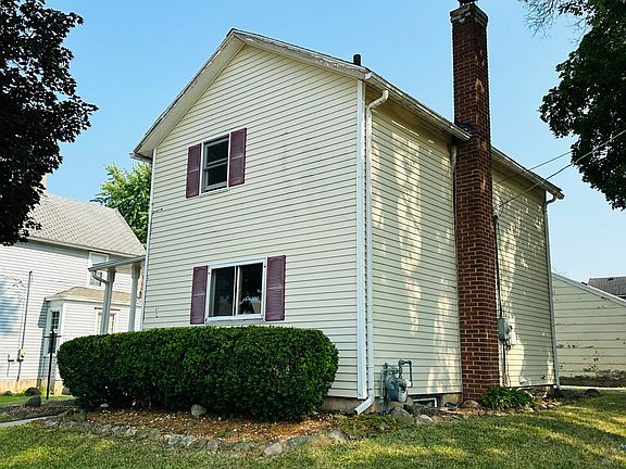 Walk up to the front porch of this 3 bed 1 bath home on corner lot. Once inside you will find the open living room with built in bookcase, closet, and door to basement. There is an eat in kitchen with plenty of room to gather. Upstairs you will find 3 bedrooms and full bath with tub shower. Outside there is a fire pit, clothesline poles, and an extra wide 2 stall detached garage.