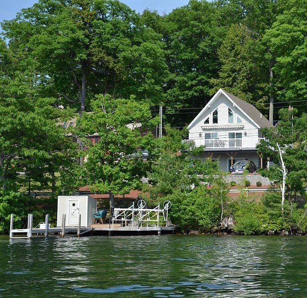 This property has all you need to enjoy the outside for all seasons. Everything is at your fingertips, including water access, two dock slips, and is minutes away from walking trails and the Gunstock Ski Resort. The bright and spacious open floor plan is ideal for keeping connected with family and guests. Enjoy the cathedral ceiling living room with a gas fireplace and walls of windows overlooking Lake Winnipesaukee. This home has five bedrooms which include a master suite with built in dressers, a master bathroom, and two closets. The front to side deck has outdoor speakers, a remote control SunSetter Awning, and overlooks the beautiful lake.