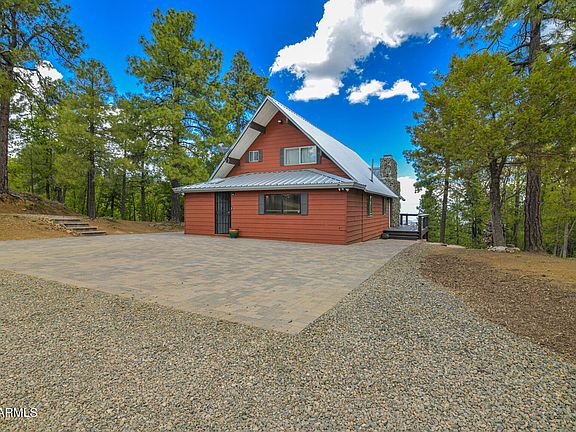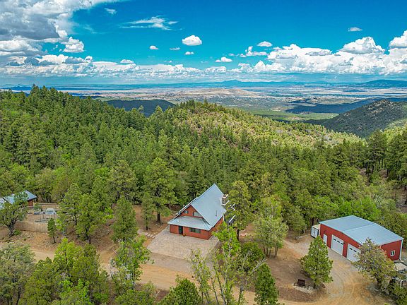 Million Dollar views in the pines, 15 min from downtown with no HOA! Stunning oversized, completely re-engineered newly constructed back deck, 8'x8' posts, 2'x10' joists, 10' top rail, modern sides take in the long-distance view of the valley. Custom built outdoor bar with Blackstone grill, seating bar area, electricity and plenty of counter space & storage. Inside find floor to ceiling 2 story views off the living, dining and upper master loft. Knotty Maple flooring, open T&G vaulted ceiling, newer hickory cabinets, newer appliances, spacious master bedroom with sitting area, inside laundry with cabinets and sink, huge walk-in kitchen pantry, new metal roof, new roof over attached garage (compressor included!), large paver driveway that can double as entertaining space. New 30x40 detache insulated garage, two 10'x10' doors with shaft driven garage door openers, 100 amp service, 220 outlets, 6" thick concrete ready for your lift, painted plywood walls ready to hang your tools, dusk to dawn exterior Edison lighting, motion light, with stunning epoxy flooring, this garage is ready for your shop and toys! New carpet in all main floor bedrooms, new master bathroom flooring, new 6ft garden fencing and raised beds, updated water heater with new valves, regulator and heating element. Smart home technology includes thermostat, garage doors and video doorbell. Park your RV with pull through areas and RV electric hook up. Newly landscaped sides, rock drainage swale and brick steps, off the side decking for easy access to lower attached garage. Separate workshop with electricity, water and whole house backup generator. Property is part of the Midnight Mine claim (gold mining) with mineral rights to new owner. 4.32 Forested acres adjoining Prescott National Forest (North and East perimeters).
