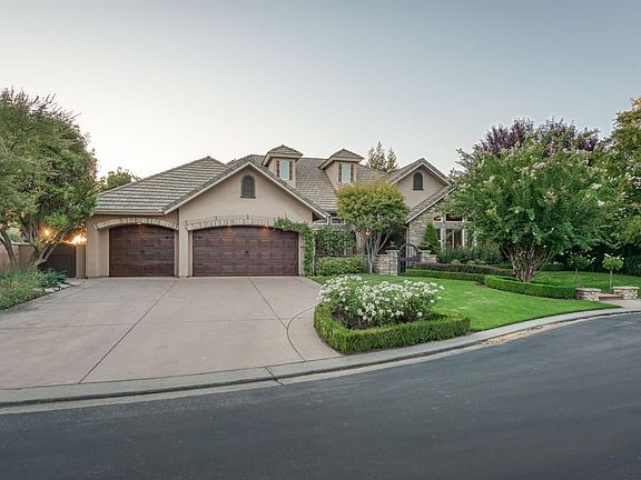 Elegance & luxury welcome you in this single-story, unduplicated custom nestled in a quiet cul-de-sac in Monte Verdi, a prestigious gated community of distinctive homes, estate size lots, tennis courts & green belts. OWNED $55K SOLARno electric bills!!! Great room, formal dining, PLUS formal liv rm that could be a media rm or 5th BR. Fabulous kitchen! Rich cherry cabinets, granite, SS appliances (gas stove, Bosch double ovens, 2 dishwashers, blt-in fridge) huge pantry, bay-window breakfast area. Serene master retreat w/frplc & travertine bath. Oversize isolated BR & BA, great for extended family. Quality amenities: heavy wood & solid doors throughout, crown moldings, wood window casings, plantation shutters, arched front door, courtyard entry, fountain, artistic stonework. 17,200 sf lot offers resort living in a very private back yard, pebble pool, waterfalls, gorgeous grounds, grass areas, large covered patio, remote awning. Clovis North schools.