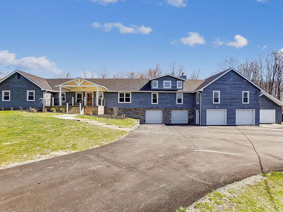 Gorgeous renovated 4 BR, 3.5 BA ranch w/over 4,300 sqr feet & 6 car garage/2 oversized sheds-on private 1.99 acres.New roof, decks, garage doors w/openers, one furnace, hot water heater and windows. Two primary suites w/attached full baths and own decks.Open concept, luxury kitchen with 10 ft island, quartz counters, 48" range and double oven. Multiple walkouts to large private deck overlooking woods. Versatile basement space roughed in for additional suite ideal for business or rental