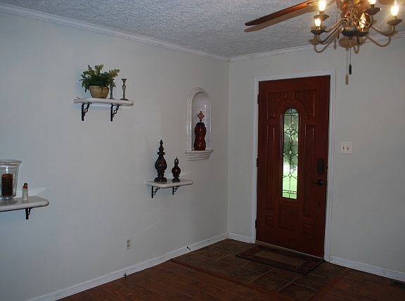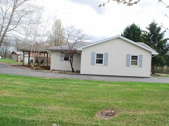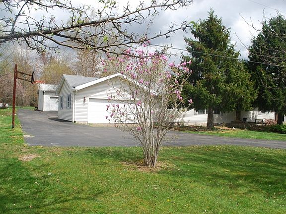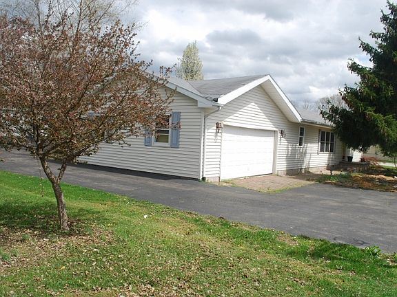 Priced to Sell! Drastically Reduced! Quiet Neighborhood, updated ranch situated on over 1/2 acre features large living room, shelving, beautiful ceiling fans, wood grain laminate flooring. Tile dining room. U shape kitchen with Corrianne counter tops, kitchen includes stove, microwave and refrigerator. Lots of storage space with ample pantry. Glass patio doors lead to large deck, new posts for hammock, privacy fence at end. Fire pit in large yard. No neighbors behind you. Get your own hot tub with the perfect place to sit it on the unique tree limb gazebo. Pole barn garage has 4 spaces with paved floor & electric. Back inside split bedrooms. Master has beautiful marble deco and glass shower. Walk-in closet and fresh paint in bedroom. Family room wired for flat screen TV. Double garage has insulated garage door and camo wallpaper. Paved drive with lots of parking. Basketball goal.