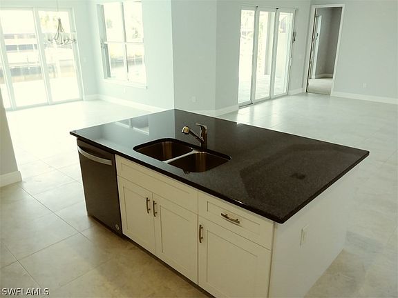 New Construction Home with 3 bedrooms + den, 3 bathrooms, 3-car garage & pool. Located on a Sailboat-Access-Canal, only a few minutes from the river. Located in the popular Palaco Grande area in SE Cape Coral. Some color selections might still be changed. This beautiful custom home has 2524 sq.ft. living area & features numerous upgrades like: Hurricane-Impact windows & doors. flat tile roof, huge modern kitchen with a 7' x 4' island, upgraded SS appliances with double oven & french door refrigerator, large walk-in pantry, white wood raised cabinets with under cabinet lighting, kitchen & bathrooms have granite counter tops & brushed nickel Moen faucets, 21' x 21' floor tile, glass tile listello in master bath, walk-through shower & freestanding tub, 11' high tray ceilings with crown molding in master bedroom & great room. 8' high sliding glass doors allow lots of light and gives access to the extra deep covered lanai with Western rear exposure & the long 30' x 13' pool with salt chlorinator & LED lighting. Spacious brick paved pool deck with screen enclosure. Lush landscaping with palm trees & automated sprinkler system. Decorative brick pavers in driveway.