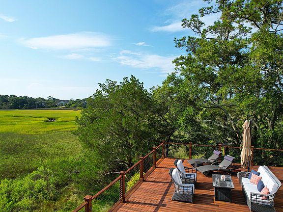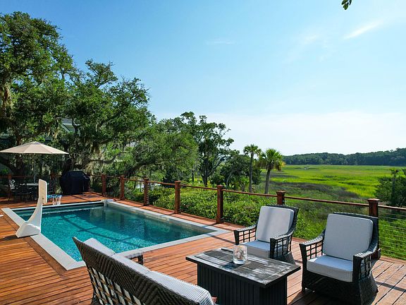 Nestled away from the road surrounded by graceful live oaks, this charming classic Southern home offers a serene escape just a 5 min walk or quick bike ride to the beach. The home features wide sunrise marsh views, ample space for indoor & outdoor entertaining, flexible floor plan, 4 large bedrooms, great room, family room, dining room & office -option for a master suite on either level, the property combines flexibility with modern comforts - hardwood floors, instant hot water, new roof, & a new HVAC system. The in-deck saline pool adds a touch of luxury, while the eat-in kitchen is equipped with quality appliances. Recently painted with new hurricane-rated rear sliders to be installed, never-rented & fully furnished home is a must-see just mins to Bohicket Marina & Freshfields Village.Exterior painted early 2024 & new hurricane rated rear sliders to be installed. This is a must see home that has not been rented & is being offered furnished with some exceptions.
