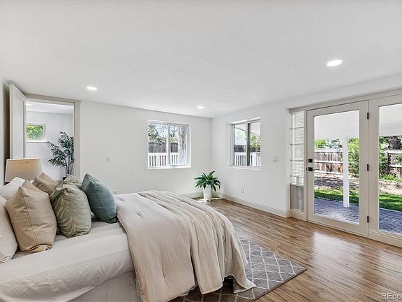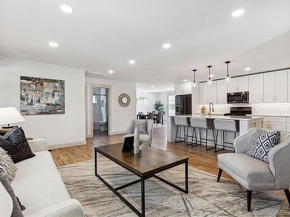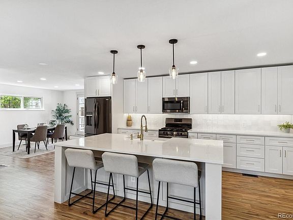 Full of natural light; this beautiful one story, University Hills home, is conveniently located on a large lot, close to local amenities and with easy access to highways. Thoughtfully remodeled by the current owner, the property offers a spacious kitchen, with new cabinetry, two bedrooms, two bathrooms, dining area, laundry room, large fenced lot with covered patio, deck & attached two car garage. The stunning kitchen has quartz counters, farmhouse sink, pantry, new refrigerator, gas stove & dishwasher. The large island offers plenty of space for dining or entertaining. Adjoining the kitchen is a comfortable family room, including traditional fireplace, dining area, with doors to deck and backyard. Laundry room is just off the kitchen and washer & dryer are included. The primary bedroom is located at the back of the home with French doors to covered patio & private backyard. En-suite bathroom has modern finishes, with large walk-in shower. Secondary bedroom is at the front of the home, with remodeled hall bathroom a few steps away. Large front and backyards have plenty of space for entertaining & in addition to an attached two car garage, there is a concrete driveway with off street parking for several vehicles. New vinyl windows, furnace, A/C & water heater. Great location, within a couple of miles of Wholefoods, King Soopers, restaurants and parks. Quick Possession!