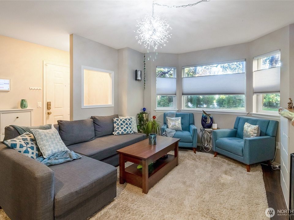 This extensively updated & lovingly maintained condo offers comfort & thoughtful details throughout. Living area features custom live edge mantle above the gas fireplace & cordless top down/bottom up shades for ground floor privacy. Updated kitchen w/ sleek black quartz counters, soft-close cabinetry & a full suite of smart appliances. Laundry w/ smart washer/dryer, barn door & custom shelving. Baths feature updated vanities, fixtures, tile & even a warm-water bidet. Each bedroom individually wired for A/C. Other features include LED lighting, keyless entry & programmable thermostats. Storage shed included. Pets welcome—ideal as home or investment! Community clubhouse offers gym, games, piano & kitchen. On WTA Green line & easy I-5 access.