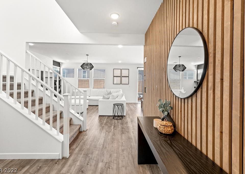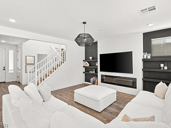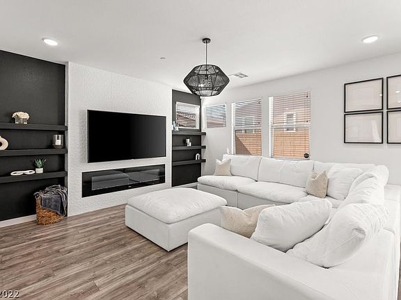 STUNNING newer home in Inspirada! This perfectly appointed 3 bedroom / 3 bathroom house has a statement accent wall upon entry, cozy great-room with contemporary fireplace and dining area includes chandelier. Quartz counter tops, pendant lighting, large island, stainless steel appliances, and herringbone tile backsplash makes this kitchen perfect for entertaining. Spacious primary bedroom has a lot of natural light, accent wall, and modern lighting fixture. Large concrete pavers and synthetic grass area add to the ample layout in the backyard. Must see!!!