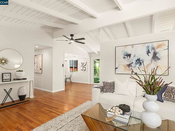Discover contemporary elegance in this sophisticated rancher, nestled in the highly sought-after Lafayette Valley Estates. This exquisite home offers a serene lifestyle on a tranquil, tree-lined cul-de-sac, featuring an updated layout. Step inside to find charming high, open beam ceilings & hardwood floors. The kitchen boasts granite countertops, a new dishwasher, gas stove, refrigerator, & plenty of cabinets. The inviting slider leads to a backyard perfect for entertaining, complete with a peek-a-boo view of Mt. Diablo adding a touch of natural splendor to your everyday life. Enjoy the peaceful ambiance of this quiet neighborhood, perfectly positioned for convenience to all that Lafayette has to offer. The level lawn & low-maintenance landscaping make outdoor living a breeze, while proximity to the popular Lafayette trails, community center, pickleball courts & Las Trampas community pool ensures endless recreational opportunities. This home is ideally located near Burton Valley Elem. & St. Mary's College. It is a true gem in a prestigious location, offering a harmonious blend of modern luxury and relaxed living. Welcome to your dream home in Lafayette Valley Estates! Open House 6/22-23 1-4 pm