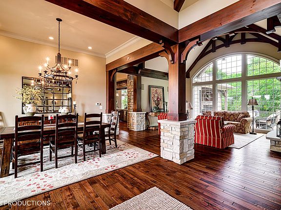 Residing in the coveted community of Pepper Creek with its estate-sized lots, nature walks, water features, & protected trees, this home with its timeless elegance nestles beautifully into its natural surroundings. Designed for grand entertaining & comfortable living, this warm & inviting home features vaulted ceilings with custom beams; natural stone accents; gas & wood-burning fireplaces; hardwood floors; gourmet kitchen with professional grade appliances. The main floor owner's retreat features 2 organized walk-in closets & refined ensuite. The guest quarters on the second floor has 2 bedrooms, ensuite, hall bath, & sitting room. Additional bedrooms can be found on the walk-out terrace level along with a spacious rec room, billiards room, card room, theatre room, & one-of-a-kind playroom. An unfinished space was designed for a golf-simulator. Outdoor spaces include a covered porch off dining room, balcony with grill and fireplace, covered patio, & firepit.