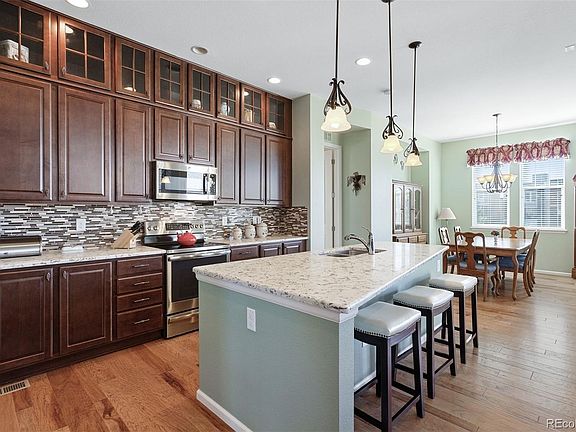 Beautiful 3-bedroom, 3-bathroom ranch style home offering one-level living at its best. From the moment you walk through the front door it will feel like home. You will be greeted by 10-foot ceilings, solid hardwood floors, an open layout, and many windows that allow the natural light to shine in. Entertaining is a breeze with a spacious kitchen island overlooking the family room and dining area. The large primary and stunning ensuite bathroom seamlessly flow into your walk-in closet that connects to the laundry room for ease of living. A second bedroom and full bath finish out your main floor. The professionally finished basement with a second family room, bar, game area, 3rd bedroom and full bath can host guests or be your quiet retreat at the end of the day. Ample extra basement storage and an oversized two car garage give you plenty of storage flexibility. Very well-maintained home waiting for you to make it your own. Low maintenance with snow removal and yard care provided by the HOA. Enjoy the ease of life within walking distance of The Meadows Town Center with restaurants, breweries, and shopping, as well as a short drive to the Outlets at Castle Rock and Downtown Castle Rock.
