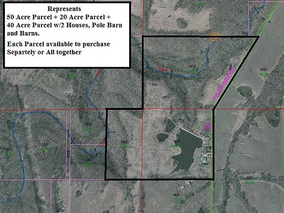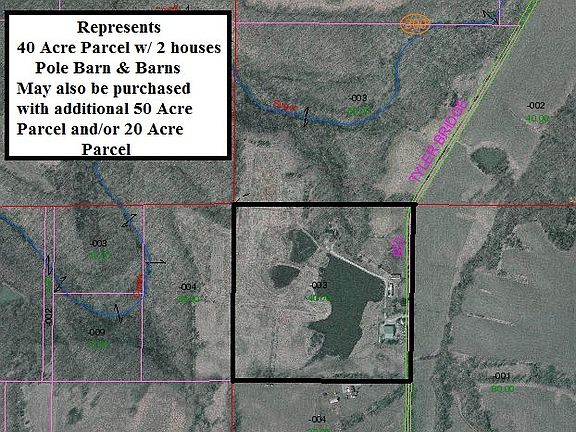 Very Unique Property on 40 rolling acres. Earth Berm style home built in 2001 plus newer 40x60 pole barn with apartmentand a separate rental home on property. Other barns on property and some acreage is fenced for horses. Main home sitsway back off road in a very private setting by a small lake. Home has very unique features with open living, dining andkitchen area with log siding and hardwood flooring and hardwood on some ceiling areas, baths have stone walls. LargeUnfinished attic space upstairs that is ready to be made into more rooms. Lots of possibilities. House was structurallyframed and built to be a complete 2 story home or more and geo thermal heat was designed and completed for the 2 storystructure. Home has that outdoor lodge feeling and there is a total of approximately 110 acres available that would beperfect for a hunting club, horse back riding, retreat, so many possibilities.